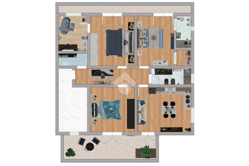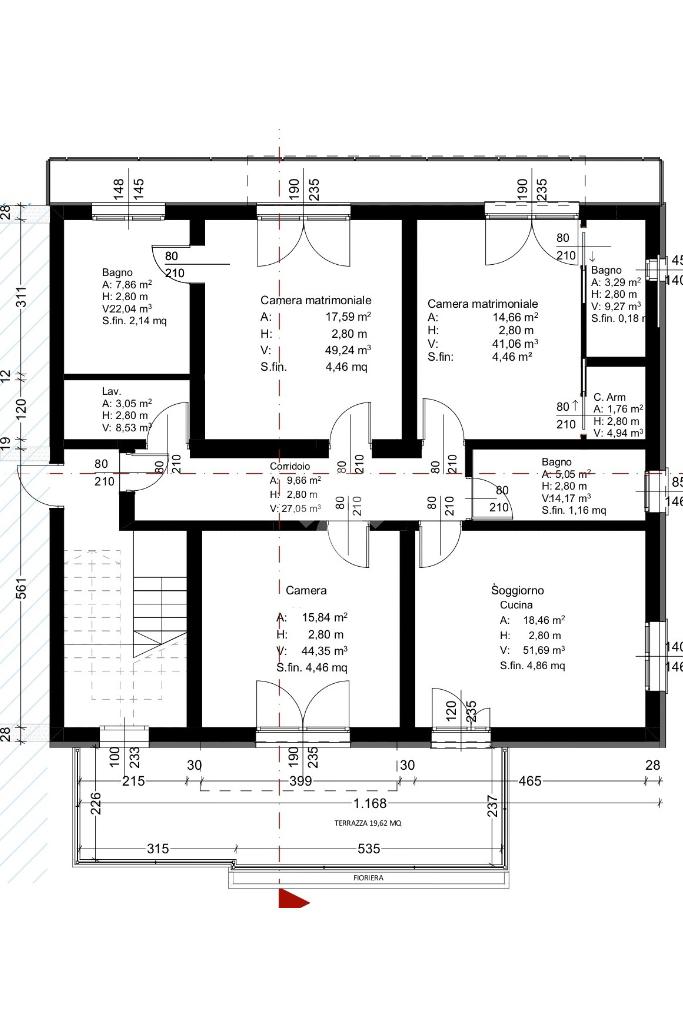 E' composto da ingresso, soggiorno con angolo cottura e accesso al terrazzo abitabile, una camera matrimoniale con cabina armadio e bagno padronale, un'altra camera matrimoniale anch'essa con bagno padronale e un ulteriore camera di 16 mq. Bagno e lavanderia.