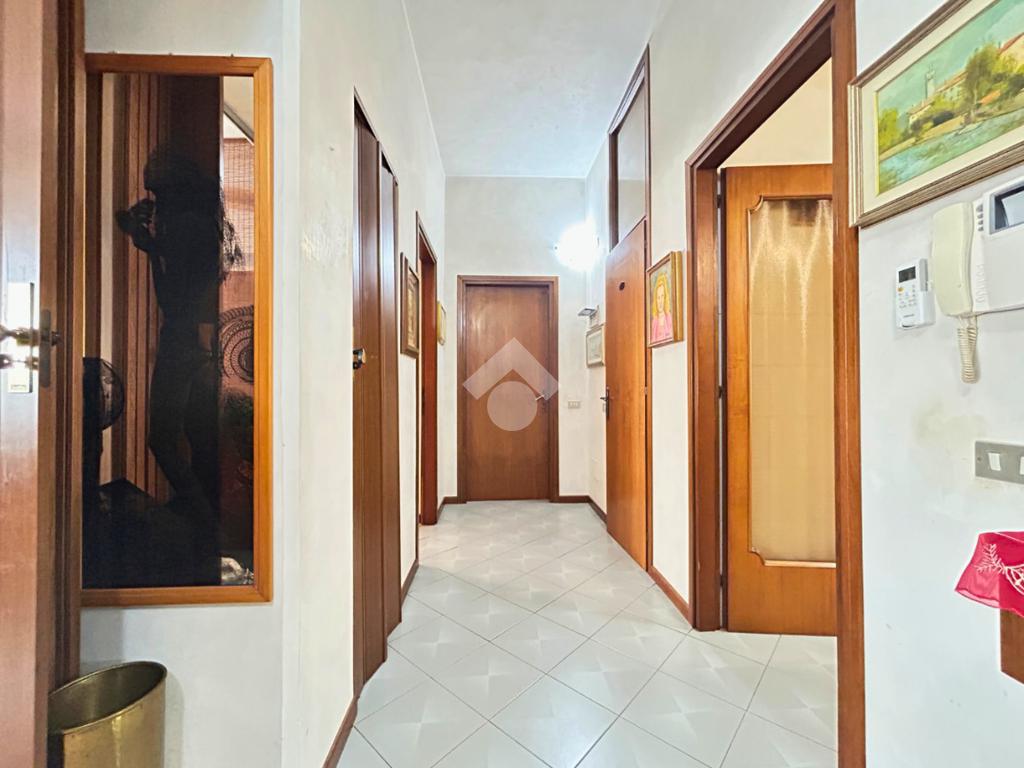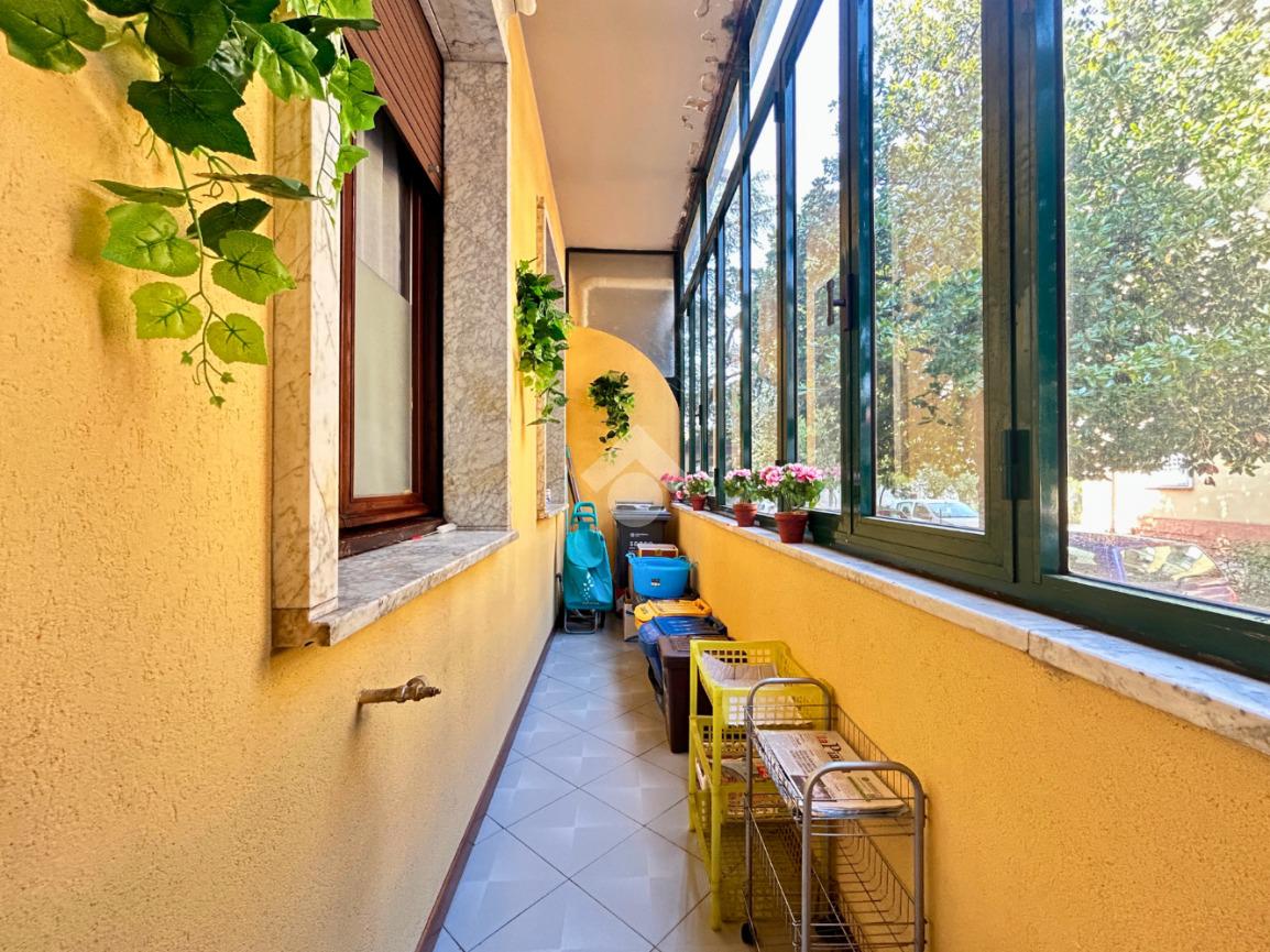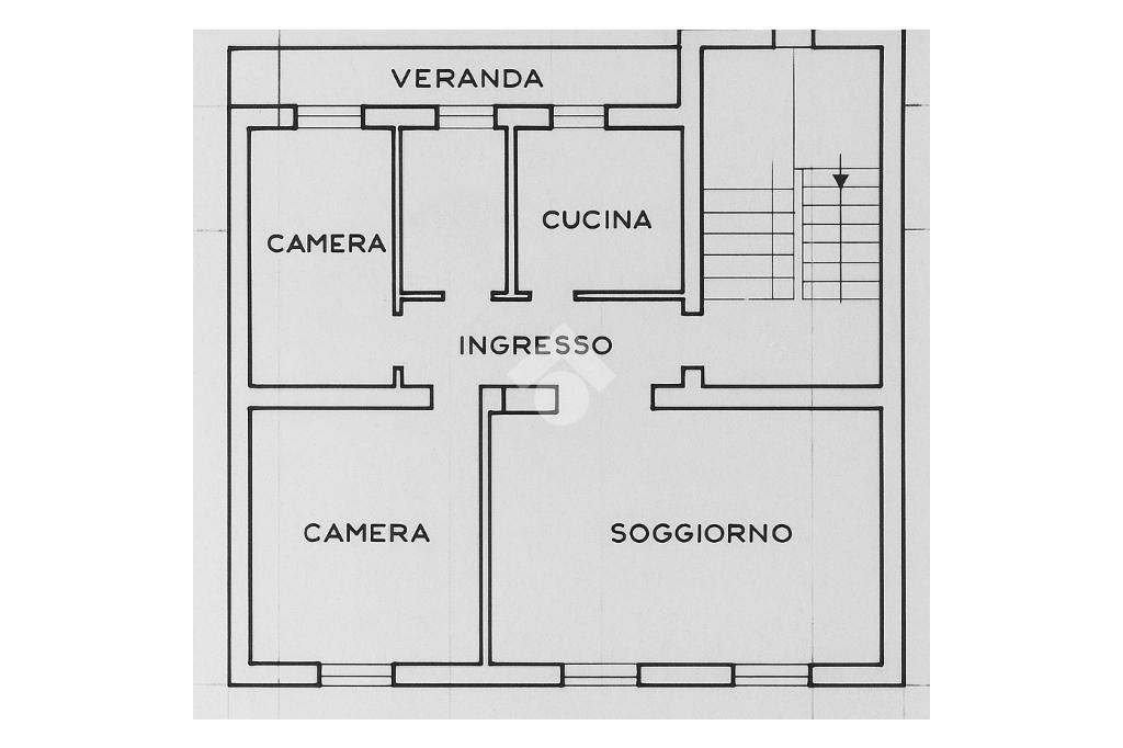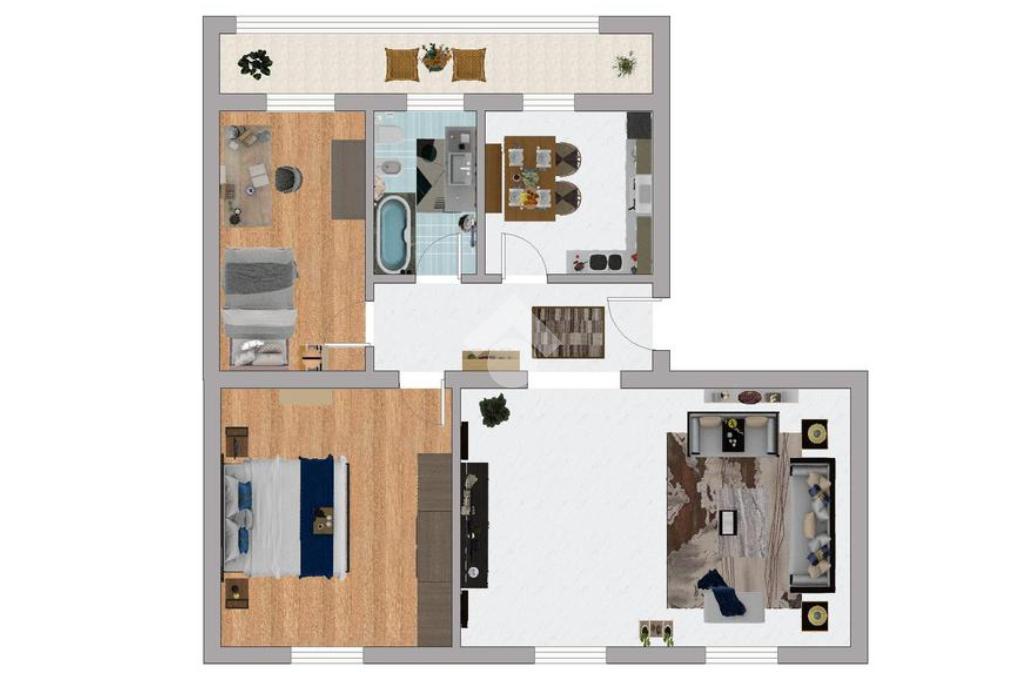 L’abitazione si apre con un ingresso che conduce a un luminoso soggiorno, e la cucina separata con accesso a una veranda. La zona notte comprende una camera matrimoniale, una camera singola e un bagno finestrato dotato di vasca. Grazie alla disposizione degli ambienti, è possibile ricavare una terza camera riducendo parzialmente l’ampiezza del soggiorno.