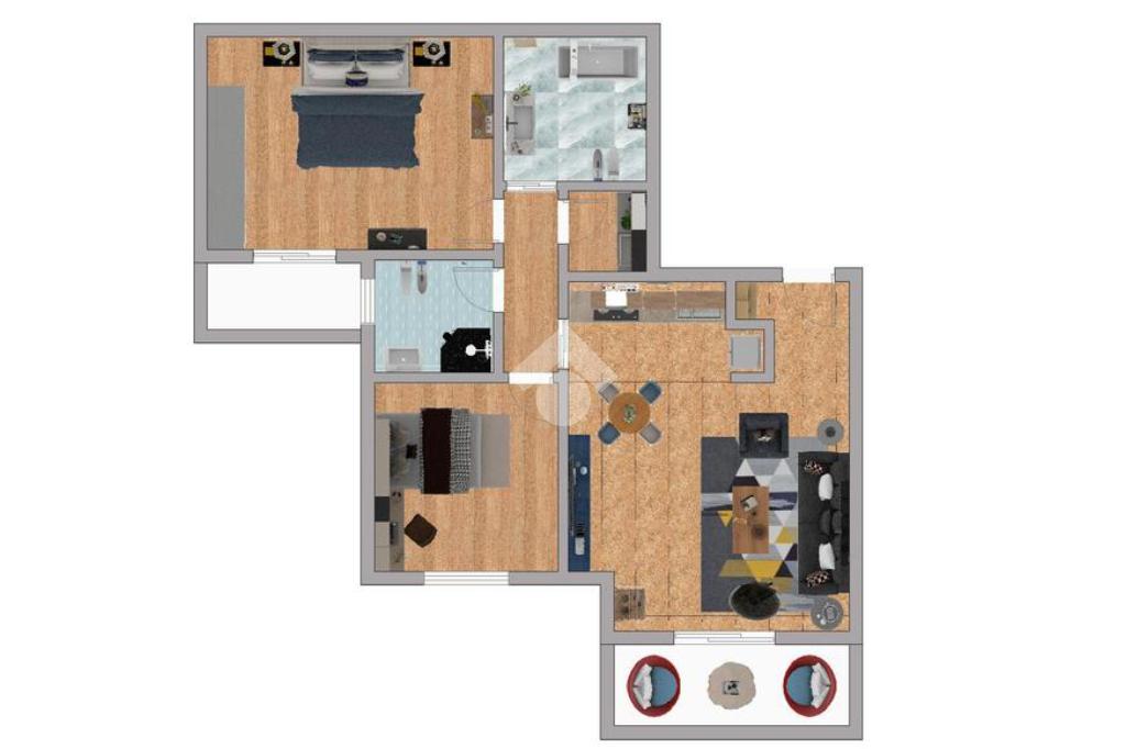 La soluzione offre un ampio open space con angolo cottura, camera matrimoniale, camera singola, doppi servizi e comodo ripostiglio.
