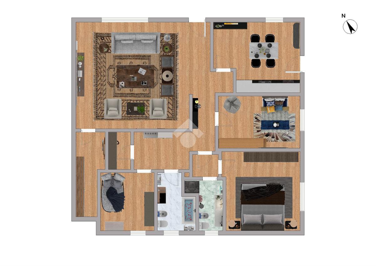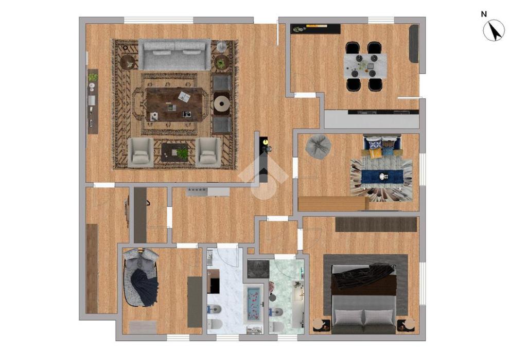 L’abitazione offre una distribuzione funzionale degli ambienti: ingresso, luminoso soggiorno, cucina separata, camera matrimoniale, camera singola, studio versatile con possibilità di essere trasformato in ulteriore cameretta, oltre a due bagni finestrati, uno con doccia e l’altro con vasca, e un comodo ripostiglio.