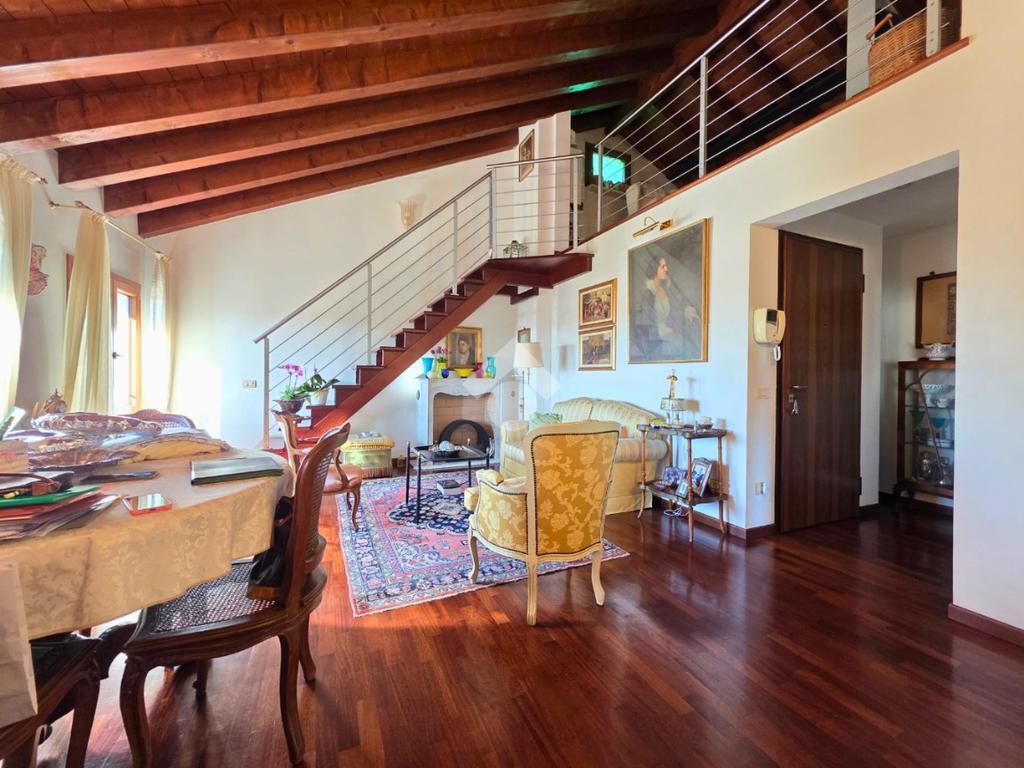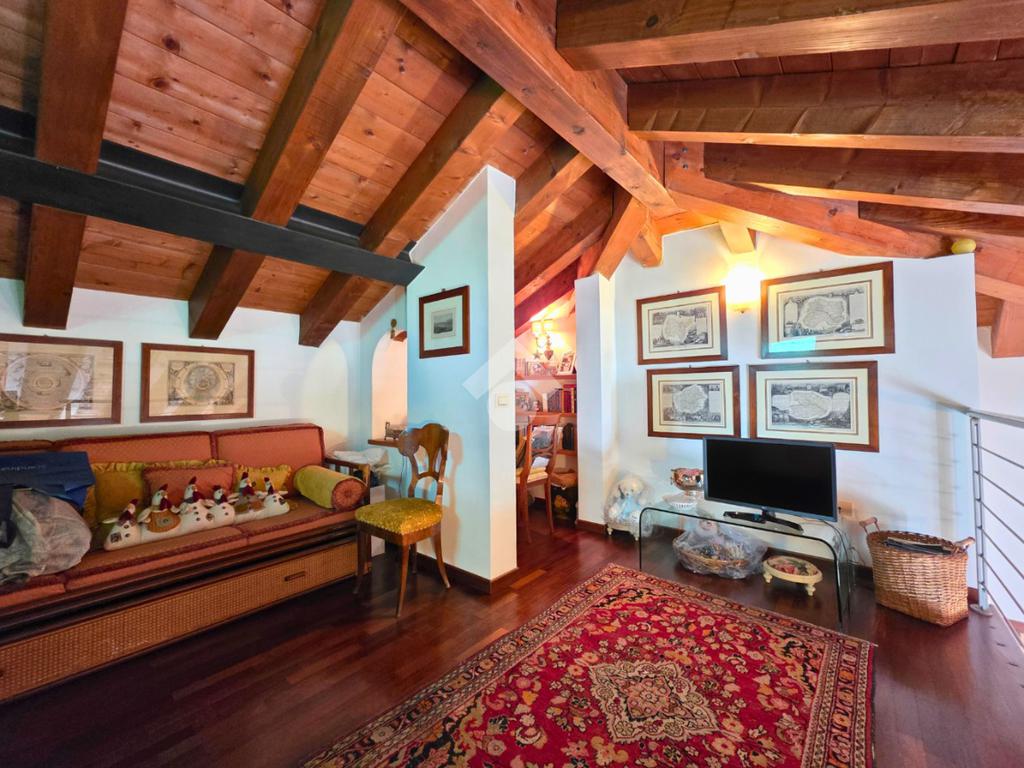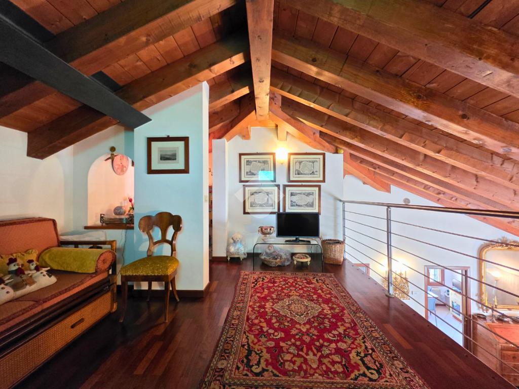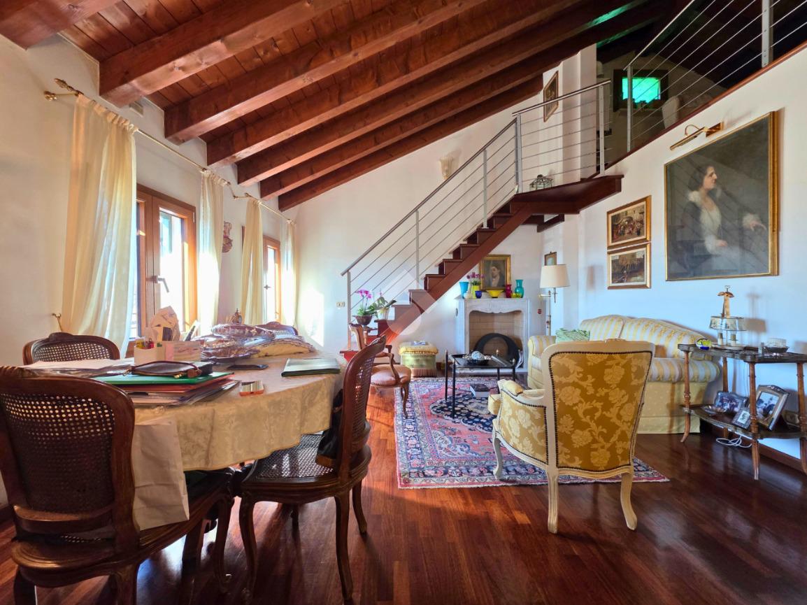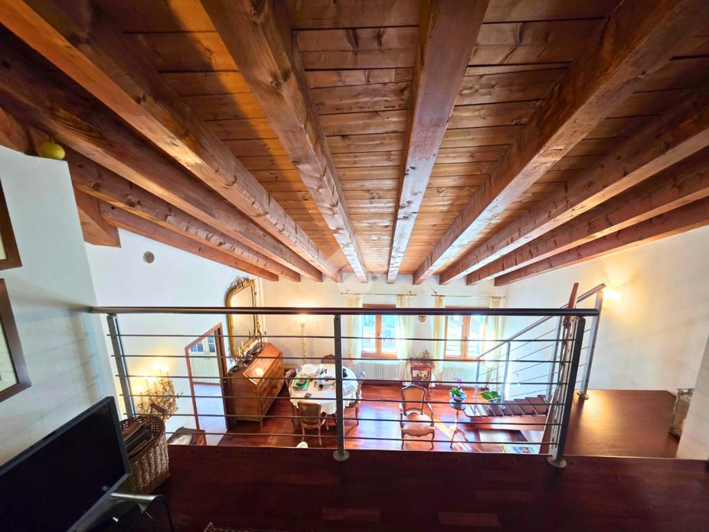 L'abitazione si sviluppa su una superficie commerciale di circa 123 mq. La zona giorno è caratterizzata da una pavimentazione in legno che si estende a tutto l'appartamento, ad eccezione della cucina e dei bagni. Un elemento distintivo degli interni è il tetto con travatura a vista in legno, che conferisce calore agli ambienti, unitamente alla presenza di un soppalco accessibile tramite una scala interna. La zona notte dispone di tre camere da letto, mentre i servizi sono garantiti da due bagni attrezzati con vasca e doccia.