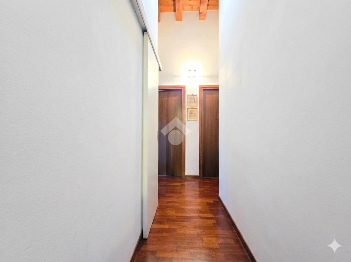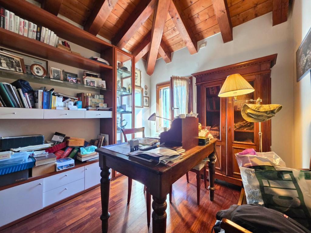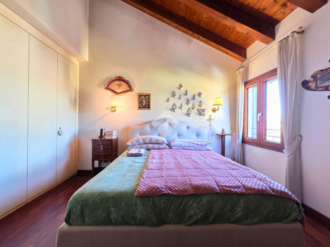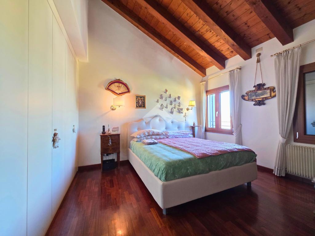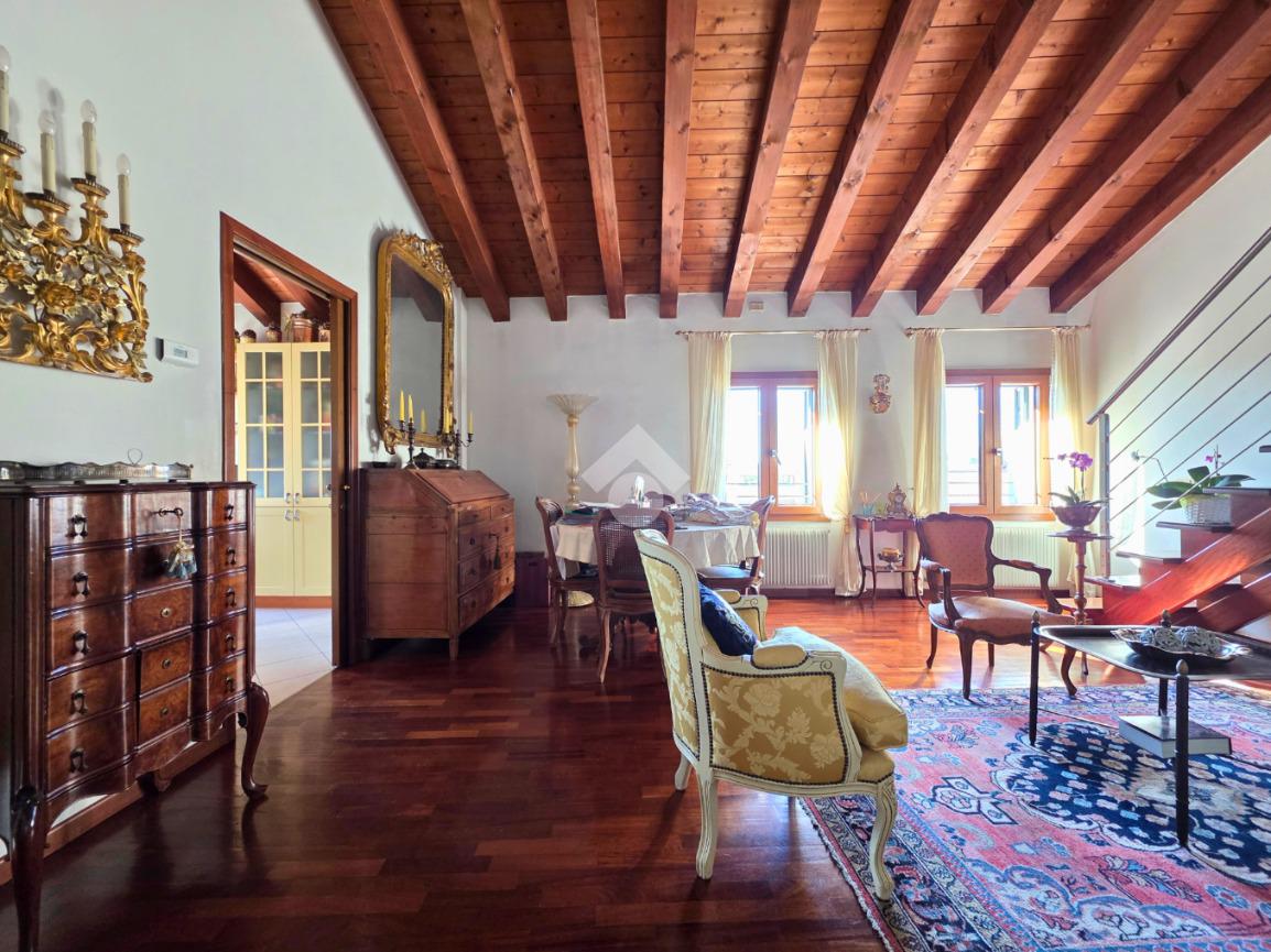 L'abitazione si sviluppa su una superficie commerciale di circa 123 mq. La zona giorno è caratterizzata da una pavimentazione in legno che si estende a tutto l'appartamento, ad eccezione della cucina e dei bagni. Un elemento distintivo degli interni è il tetto con travatura a vista in legno, che conferisce calore agli ambienti, unitamente alla presenza di un soppalco accessibile tramite una scala interna. La zona notte dispone di tre camere da letto, mentre i servizi sono garantiti da due bagni attrezzati con vasca e doccia.