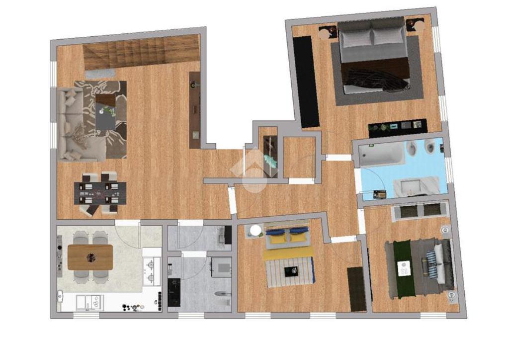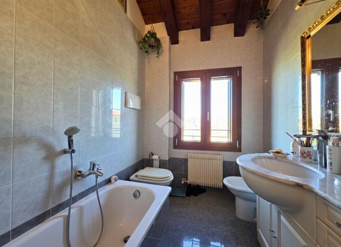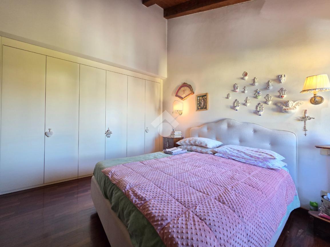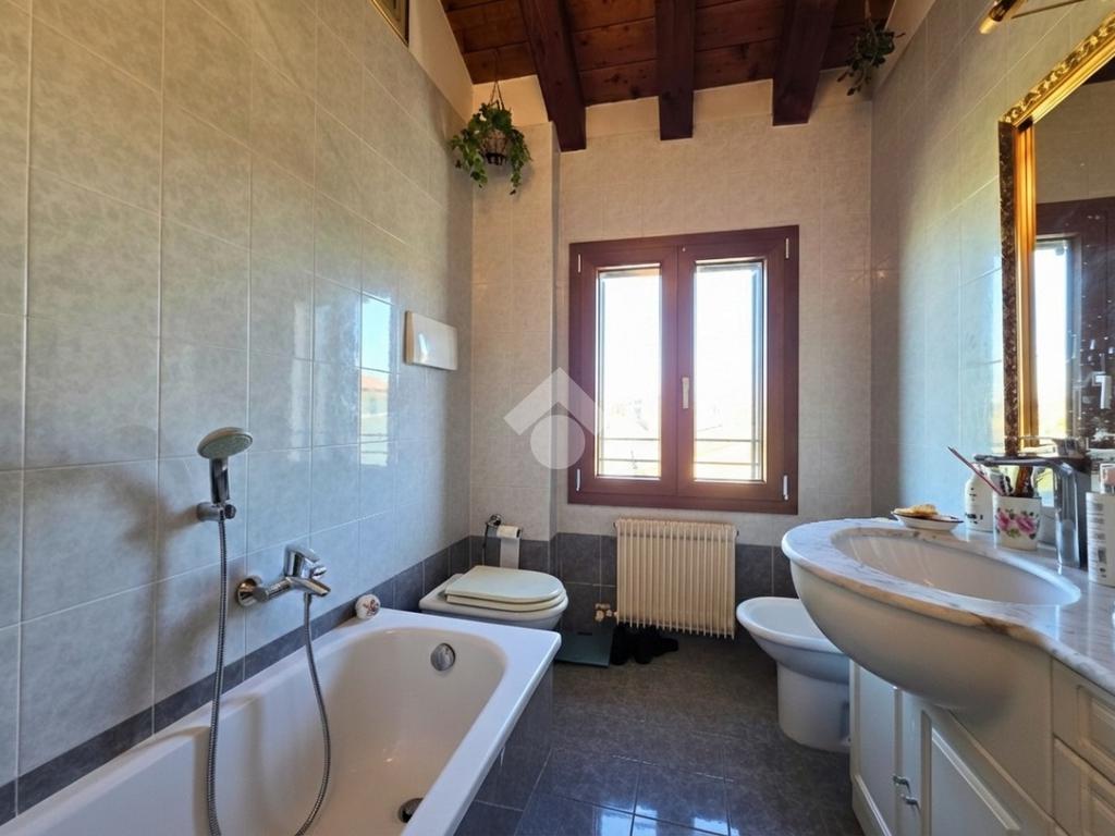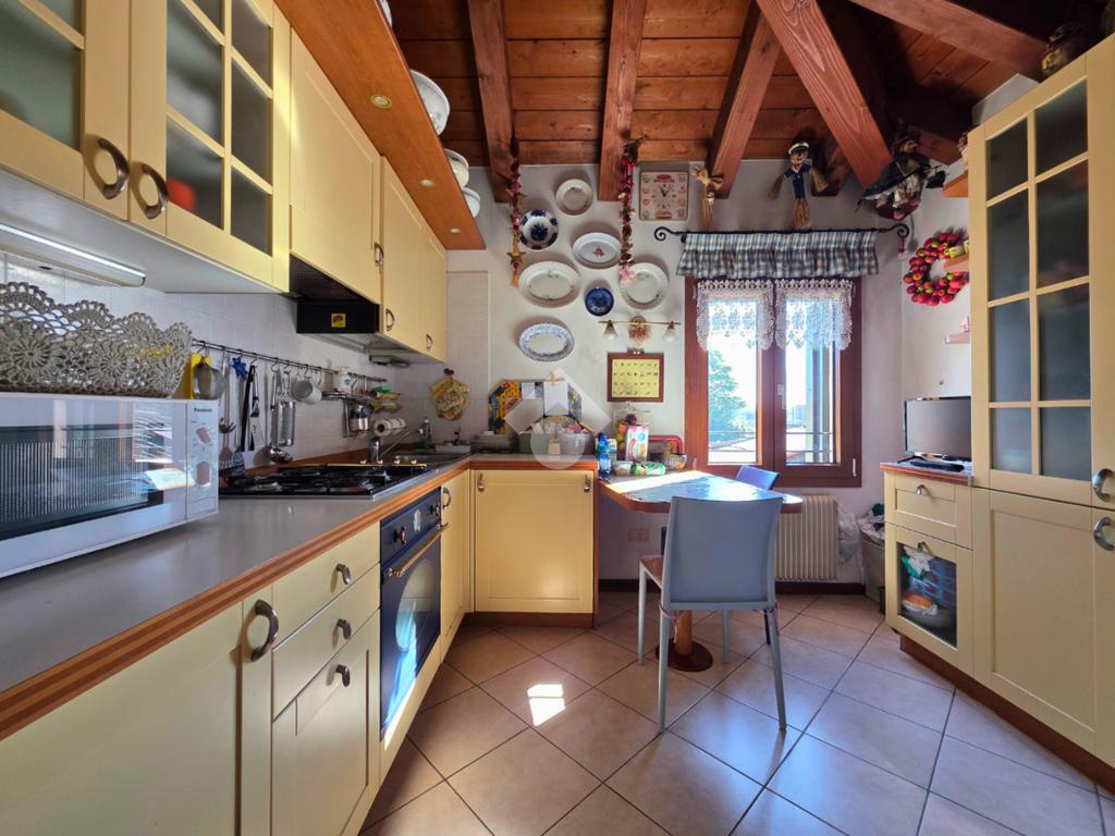 L'abitazione si sviluppa su una superficie commerciale di circa 123 mq. La zona giorno è caratterizzata da una pavimentazione in legno che si estende a tutto l'appartamento, ad eccezione della cucina e dei bagni. Un elemento distintivo degli interni è il tetto con travatura a vista in legno, che conferisce calore agli ambienti, unitamente alla presenza di un soppalco accessibile tramite una scala interna. La zona notte dispone di tre camere da letto, mentre i servizi sono garantiti da due bagni attrezzati con vasca e doccia.