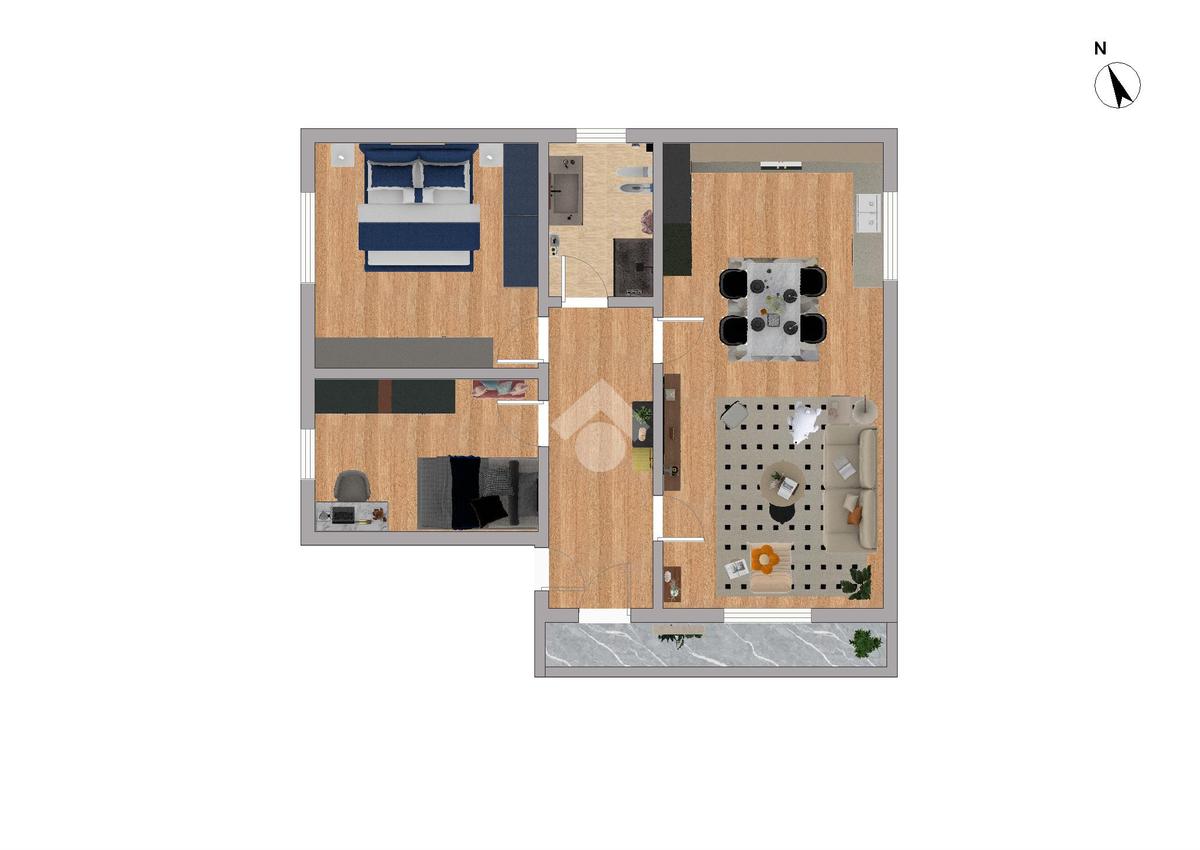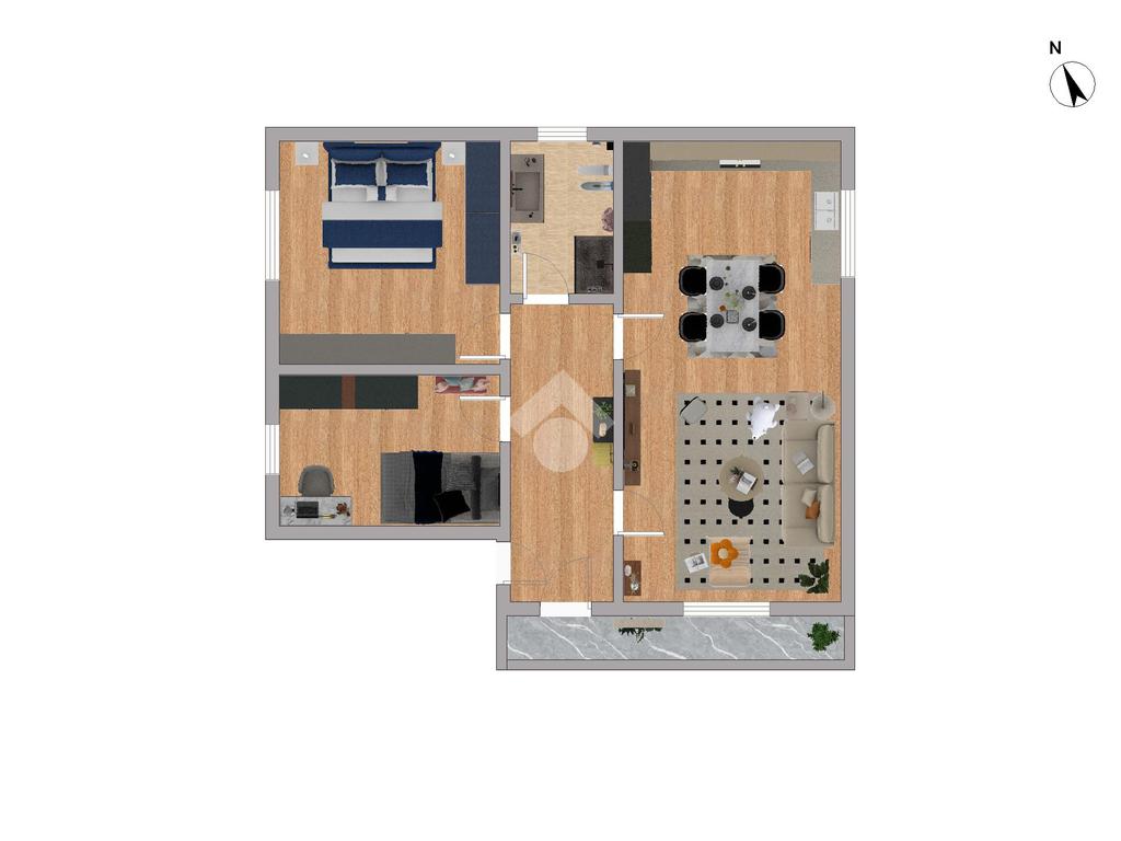 L’ingresso, protetto da porta blindata, si apre su un comodo disimpegno che distribuisce in modo ottimale gli spazi. Sulla destra si sviluppa la zona giorno in open space che si espone completamente a sud.